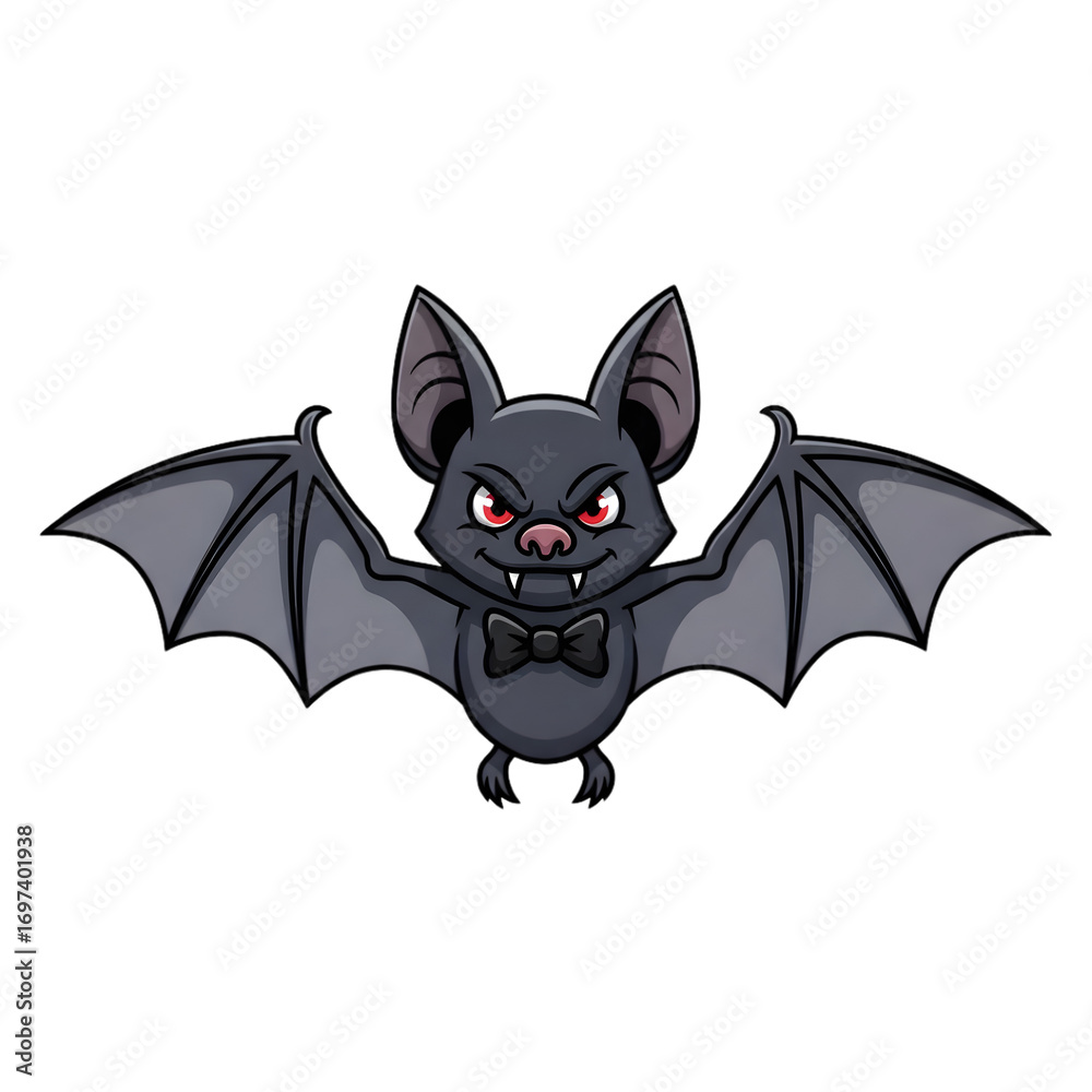 Spooky yet charming cartoon bat with red eyes and bow tie, ready for Halloween fun, party invitations, or whimsical designs, bringing a playful fright to any project.