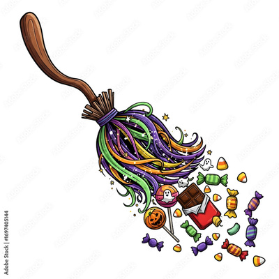 Whimsical Halloween broomstick magically scattering colorful candies and spooky treats for an enchanting holiday celebration