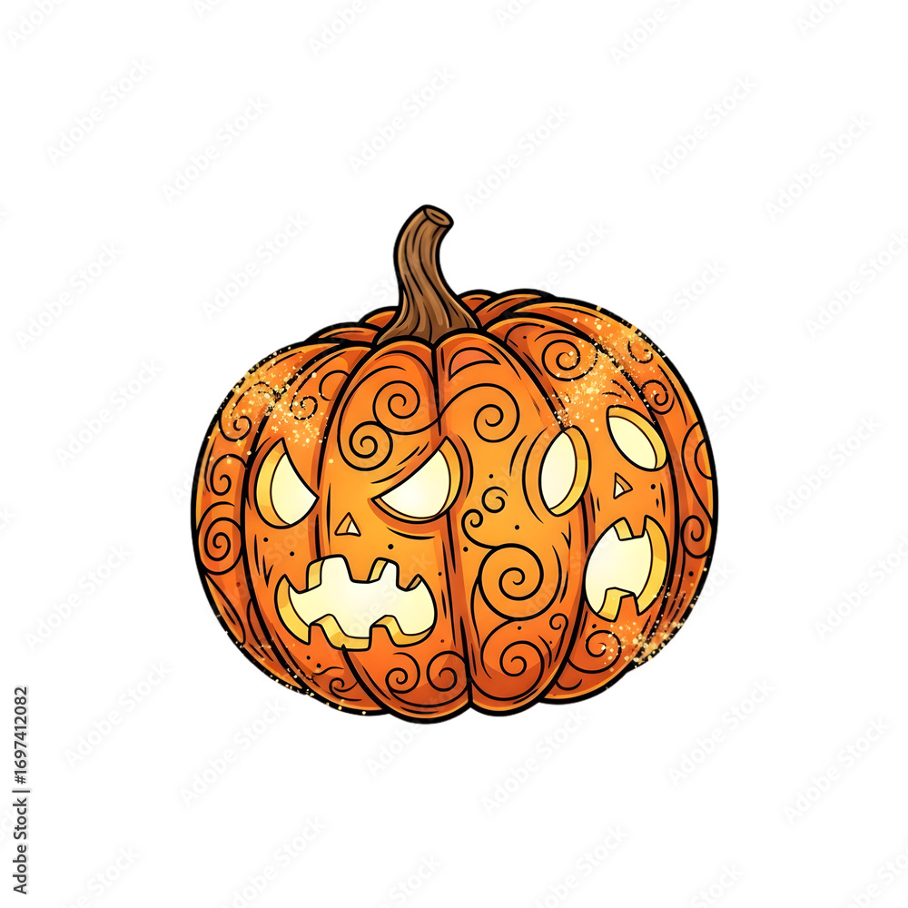 Spooky, glowing jack-o-lantern with intricate swirling patterns and sparkling festive lights perfect for Halloween celebrations and seasonal decor projects