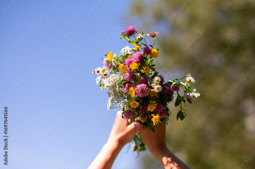 Wildflower bouquet held up to the sky outdoors, close up on flowers