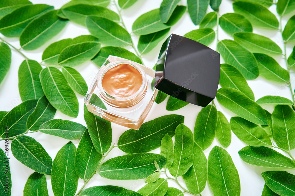Orange cream bottle placed, Blank label package for mock up on a green foliage background and flowers. The concept of natural beauty products.