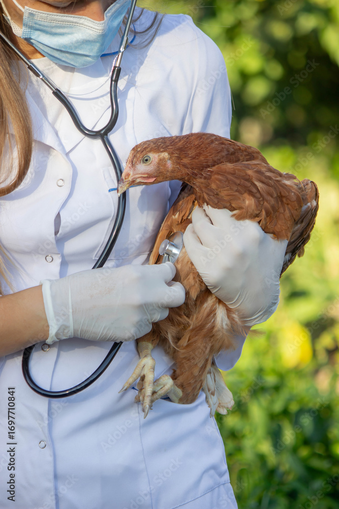 Veterinarian examining chicken with stethoscope