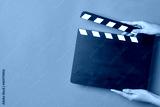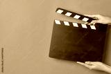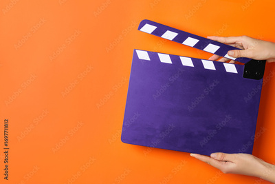 Woman holding purple clapperboard on orange background, closeup with space for text. Film industry