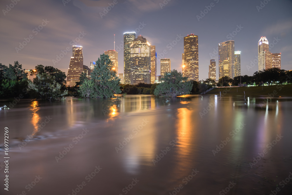 Reflection of Downtown Houston skyscrapers on a pond of overflow water from Bayou River to Eleanor Park after Harvey tropical storm. Heavy rain of hurricane Harvey caused many flooded areas in Houston