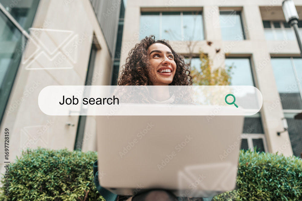 Young woman using a laptop for a job search in an outdoor urban setting during daytime