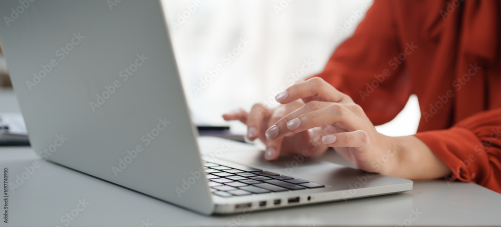 Freelancer working from home typing on laptop keyboard