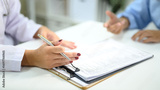 Physician filling out medical forms while listening to a patient in a clinical. Health care concept