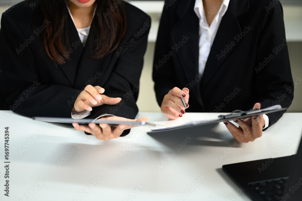 Close up of two businesswomen discussing documents and notes during a meeting