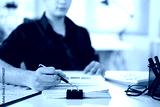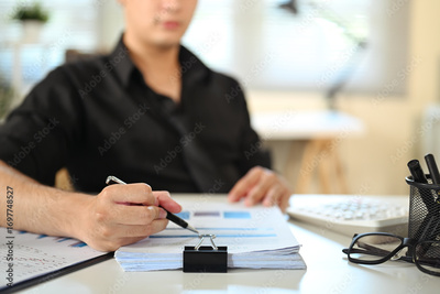 Close up of businessman reviewing documents and highlighting data in office