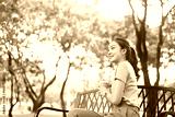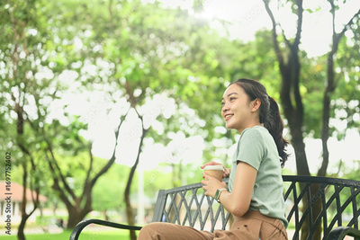 Casual woman enjoying a coffee break on a park bench, representing relaxation, and wellness
