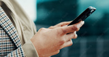 Phone, hands and businesswoman in city with contact, communication or connectivity online. Technology, networking and female corporate employee with cellphone for email on mobile app in urban town.