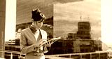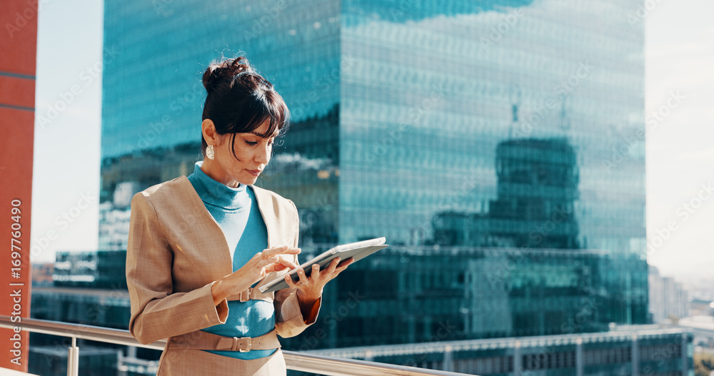 Tablet, rooftop and businesswoman in city with online research for finance report with company budget. Digital technology, balcony and female financial manager with investment proposal in urban town.