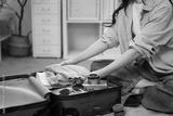 Traveler arranging sweaters and accessories neatly in a luggage, preparing for a holiday trip