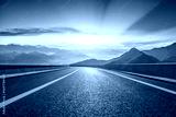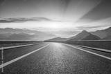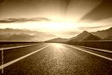Asphalt highway curves through beautiful mountain with dramatic sky at sunrise