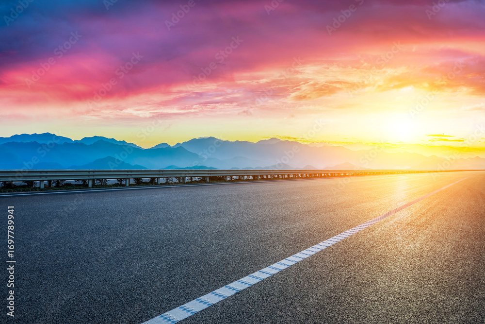 Empty asphalt highway road and mountain range silhouette with beautiful sky cloud at sunset