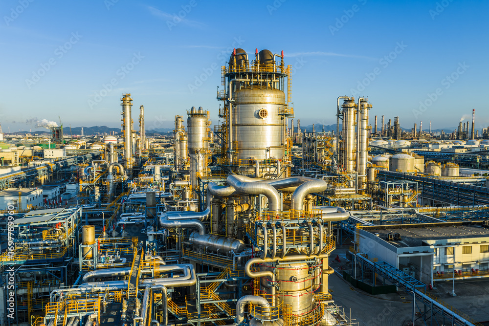 Aerial view of a large oil refinery and petrochemical plant with complex equipment in industrial zone