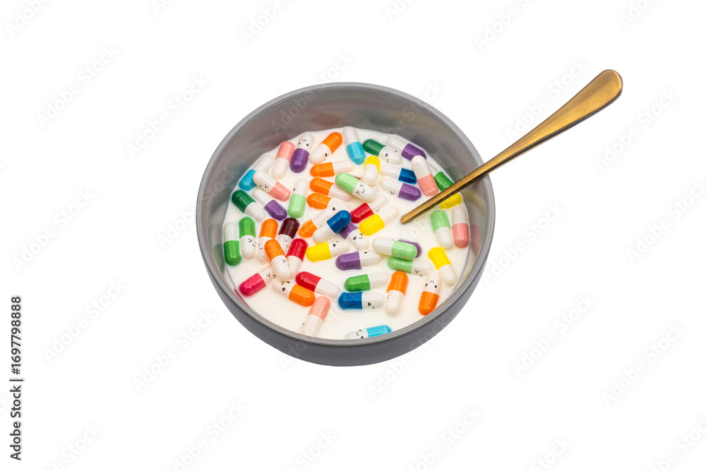 breakfast with multicoloured medicine capsulles in a bowl with milk and a golden spoon