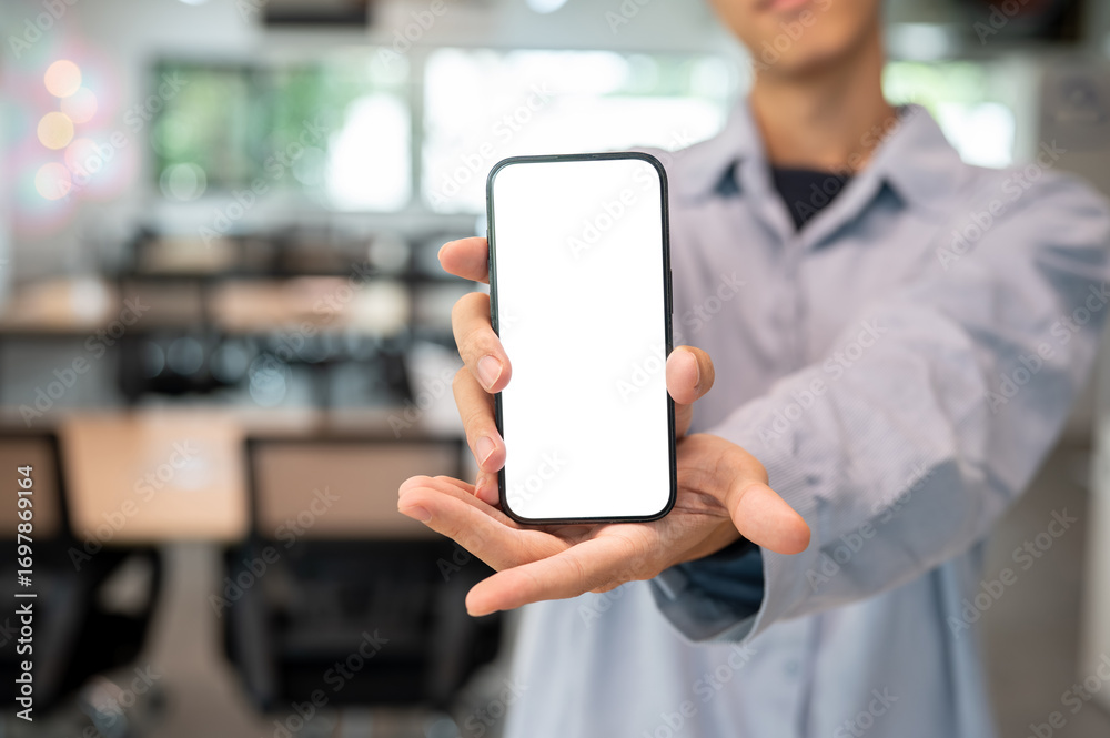 Close up of man holding blank screen smartphone with both hands while standing in cafe or classroom.