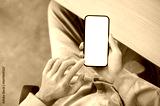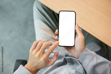 Blank screen smartphone holding with both hand while sitting at wooden table in a cafe or classroom.