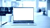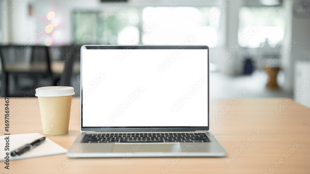 Blank screen laptop aside coffee cup and a pen atop notebook on wooden table in the cafe or lounge.