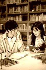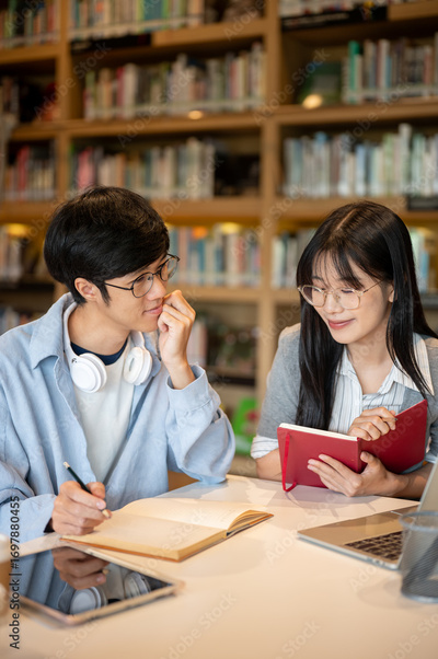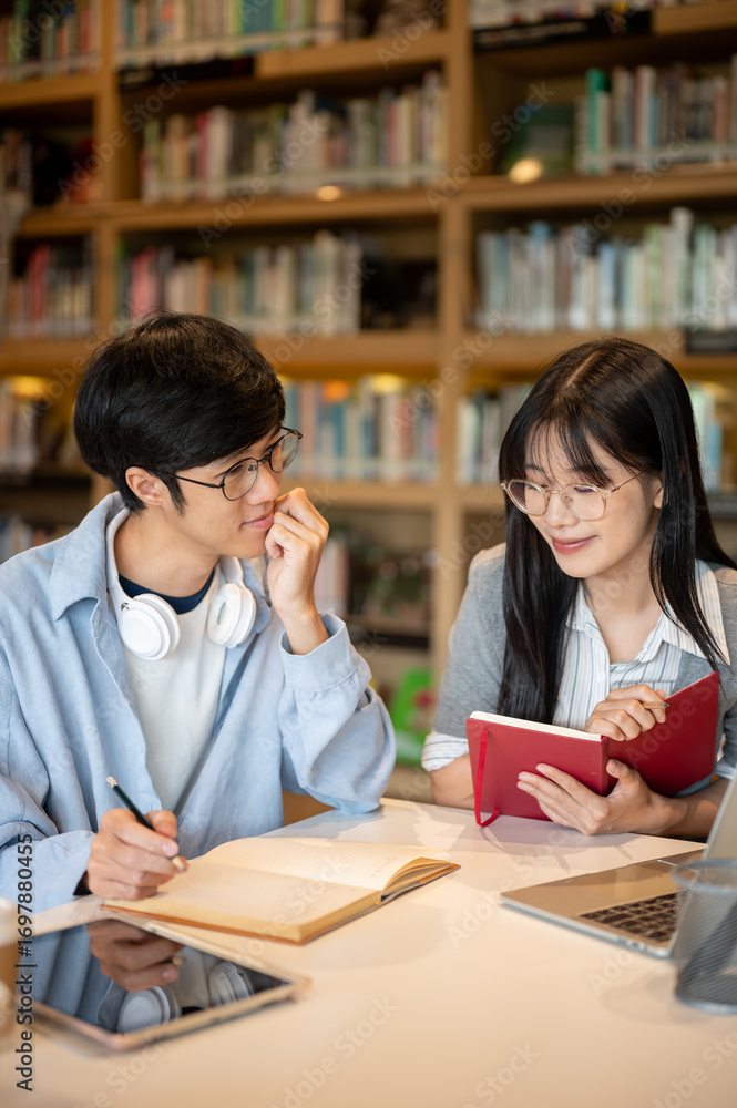 Glasses asian man student smiling looking at book holding by woman friend at wooden table in library