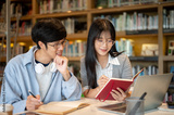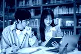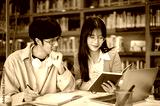 Glasses asian man student smiling looking at book holding in woman friend's hand at table in library