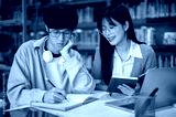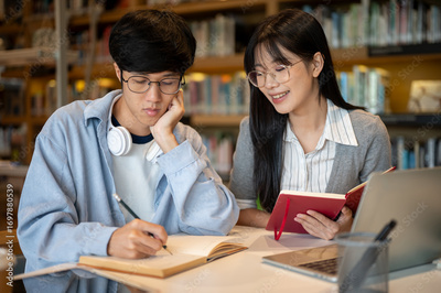 Glasses asian woman student smiling and looking at man friend writing in notebook at library's table
