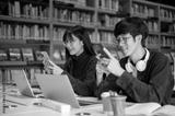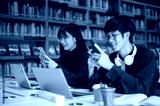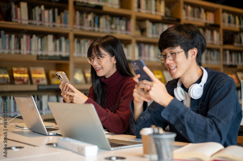 Glasses asian woman student and a man friend looking at their phone while sits at table in library.