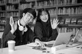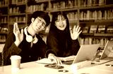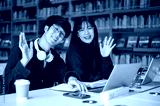 Smiling glasses asian man student and a woman friend waving a hand while sitting at library's table.