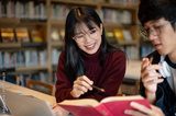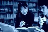 Glasses asian woman student pointing pencil at book man friend holding while sits at library's table
