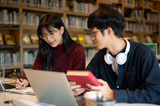 Glasses asian man student looking at woman friend writing in notebook while sits at table in library