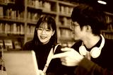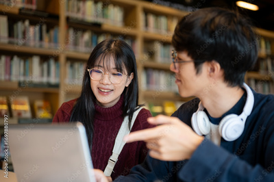 Glasses asian woman student talking and looking at man friend's laptop while sits at library's table