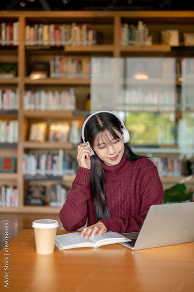 Asian woman holding headphone listening to music and looking at laptop aside coffee at library table