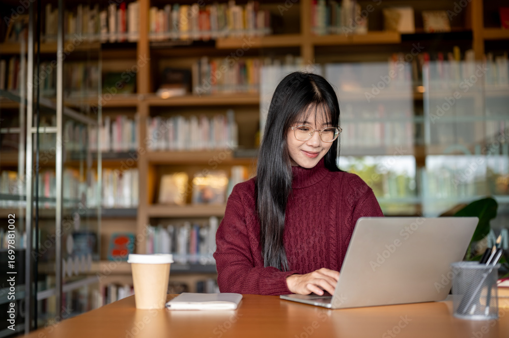 Glasses asian woman smiling while using or working on laptop aside coffee on wooden table in library