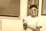 Conical flask holding dark blue liquid is resting on classroom desk, near green chalkboard