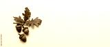 Branch with green oak tree leaves and acorns on colored background, close up top view