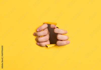 Human hands tearing yellow paper background