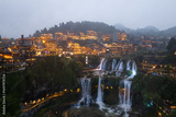 The ancient village of Furong Town cascades down a hillside with bright lights glowing at dusk, showing a beautiful waterfall scene.