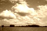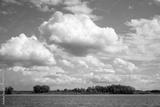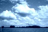Landscape along the St. Lawrence River with a strip of land covered in trees on the horizon. The sky is dominated by large, fluffy white cumulus clouds against a blue sky background