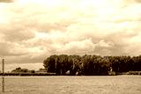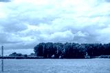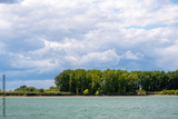 Landscape along the St. Lawrence River with a strip of land covered in trees on the horizon. The sky is dominated by large, fluffy white cumulus clouds against a blue sky background