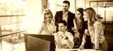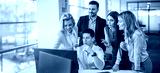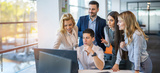 Business team collaborating on project around computers during office meeting