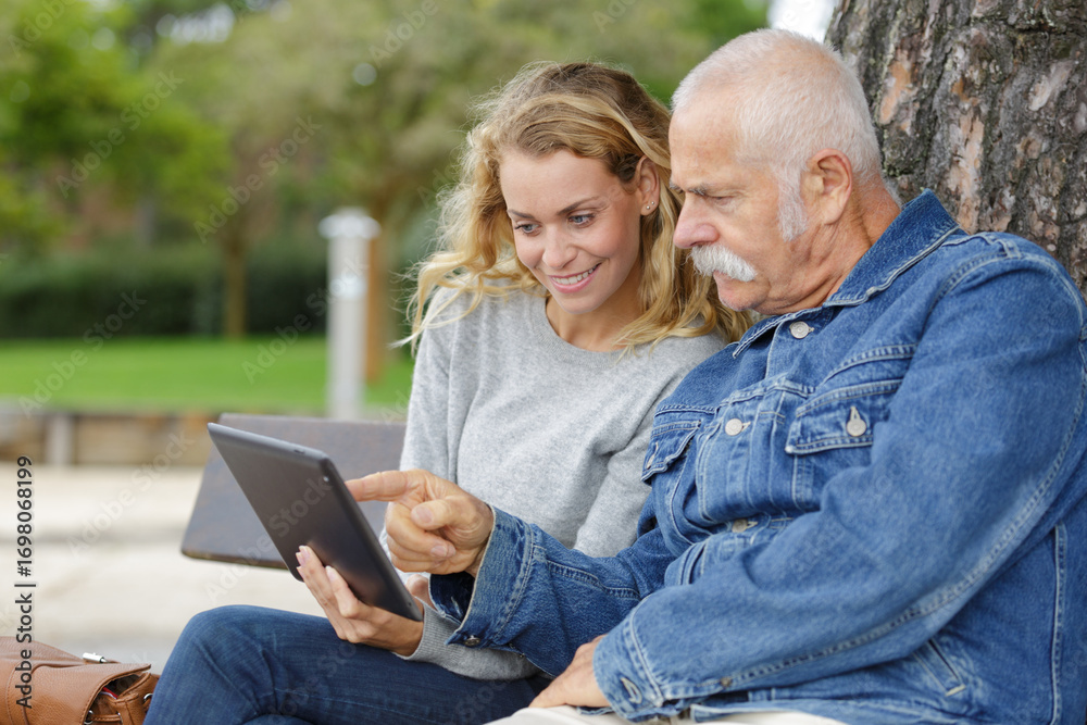 daughter teacher old man to use a tablet