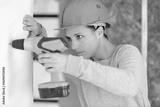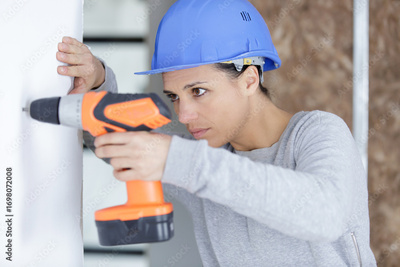 a female builder drilling wall