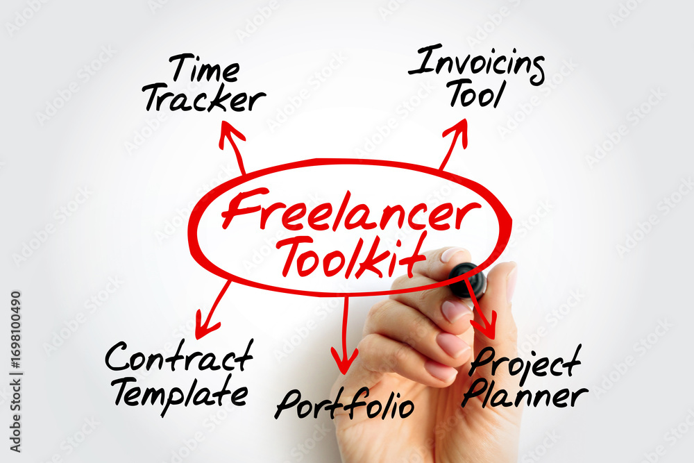Diagram of essential Freelancer Toolkit items including time tracker, invoicing tool, contract template, portfolio, and project planner on background