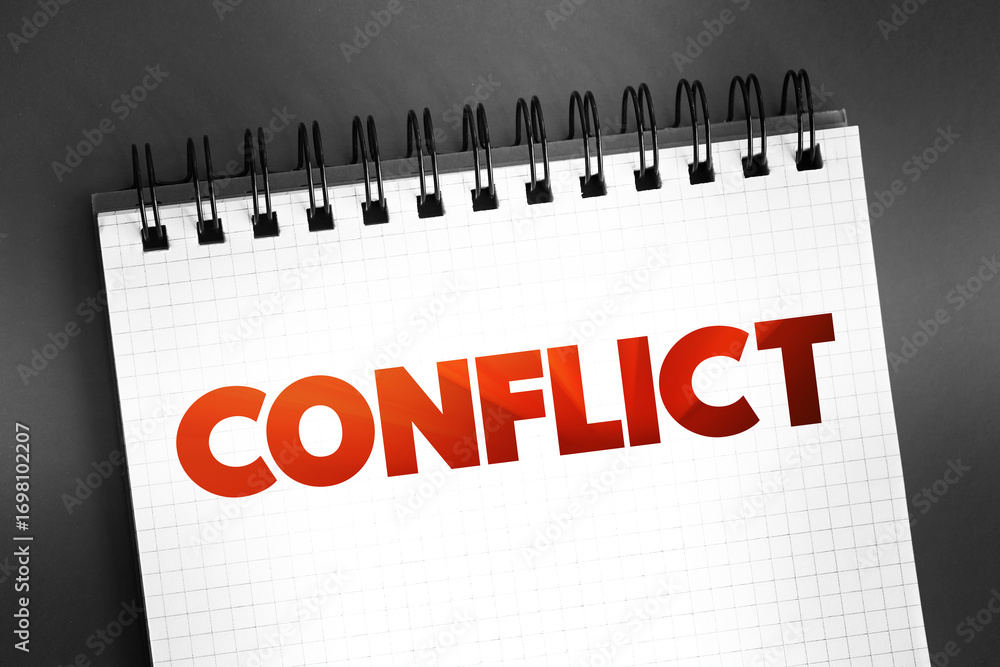 Conflict - struggle and a clash of interest, opinion, or even principles, text on notepad concept background