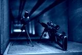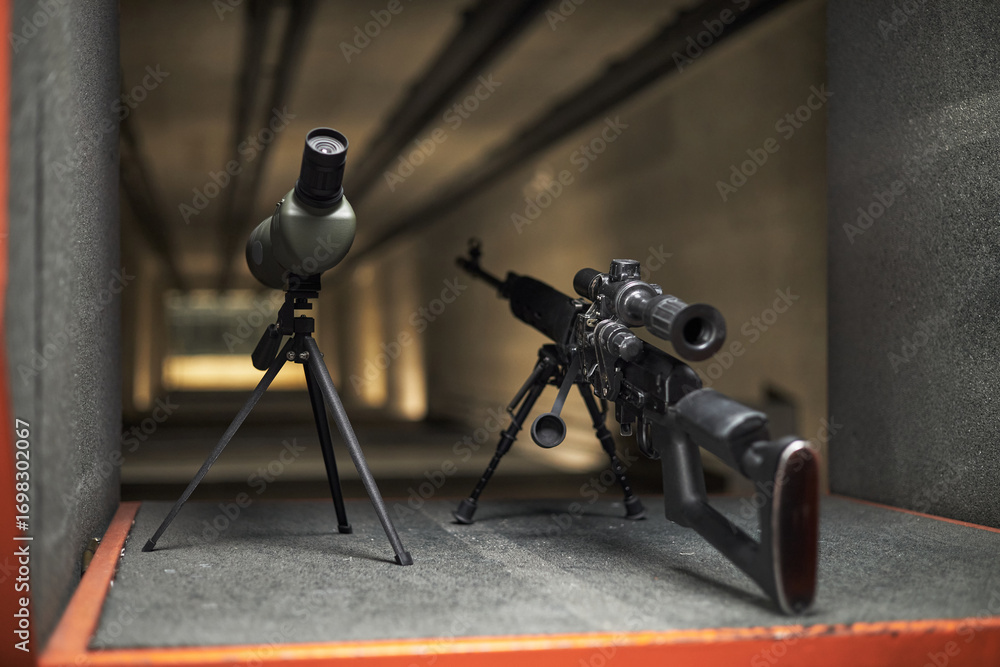 Precision rifle with mounted scope positioned on bipod next to spotting scope on tripod inside indoor shooting range, both devices arranged for long distance target practice