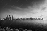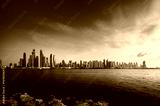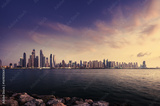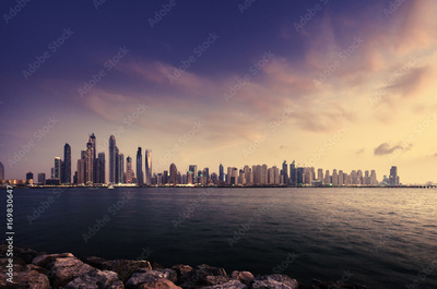 panorama of skyscrapers in Dubai Marina, sunset time, UAE