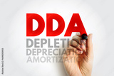 DDA Depletion Depreciation Amortization - accounting technique that a company uses to match the cost of an asset to the revenue generated by the asset, acronym text concept background