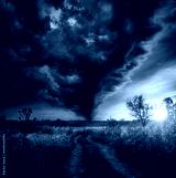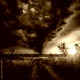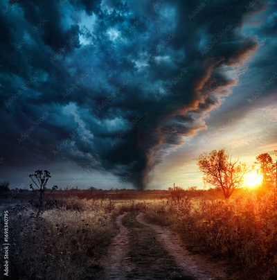 Collage, not AI. Powerful tornado funnel cloud forming over a rural field during sunset. Concept of natural disaster, extreme weather and climate change.