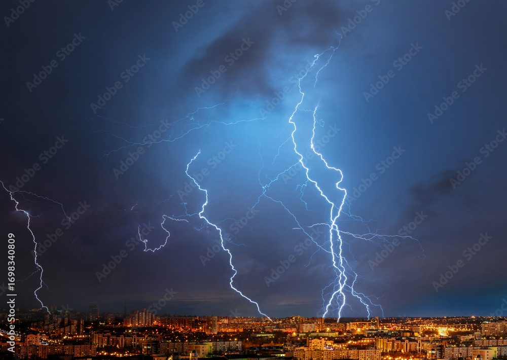 Lightning discharges in the evening sky over the city. Image on the topic of weather, natural phenomena, etc.
